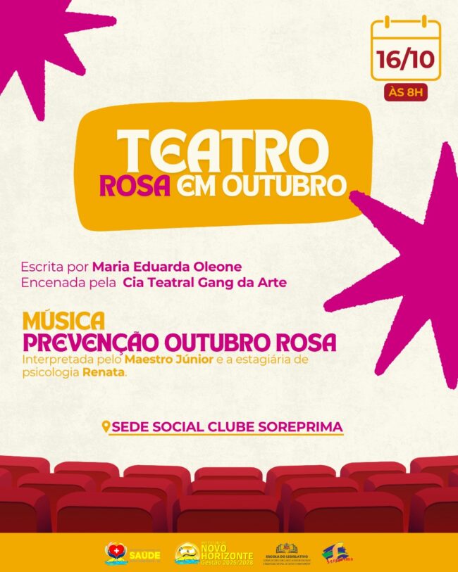E a Prefeitura de Novo Horizonte e a Câmara Municipal convidam toda a população para participar do evento especial “Teatro Informativo: Rosa em Outubro”, no dia 16 de outubro de às 8h, na Sede Social do Clube Soreprima.A peça, escrita por Maria Eduarda Oleone e encenada pela Cia. Teatral Gang da Arte, sob a direção do Professor Junior, traz uma reflexão importante sobre o Outubro Rosa e a prevenção ao câncer de mama.
