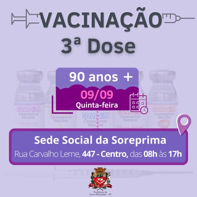 Saúde inicia aplicação da 3ª dose da vacina contra a Covid-19 em idosos acima de 90 anos A Secretaria de Saúde de Novo Horizonte iniciará a aplicação da 3ª dose da vacina, contra a Covid-19, a partir desta quinta-feira (9), em idosos com 90 anos ou mais, que receberam a 2ª dose a pelo menos 6 meses. Este grupo será o primeiro a receber o reforço vacinal. Idosos com 90 anos ou mais que estão acamados devem solicitar o agendamento através do telefone 17 99683 7555 e somente para o idoso que possuir dificuldade de locomoção ou não tenha condições de descer do carro, a 3ª dose da vacina será aplicada na UBS Alvorada, das 13h às 17h. Vale ressaltar que é necessário apresentar RG e CPF, além do Cartão para comprovar as duas primeiras doses, na Sede Social da Soreprima, das 8h às 17h.