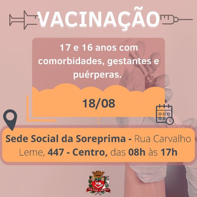 Secretaria de Saúde inicia amanhã vacinação para adolescentes de 17 e 16 anos com comorbidades, grávidas e puérperas Nesta quarta-feira, 18, a Secretaria Municipal de Saúde inicia a vacinação contra Covid-19 em adolescentes de 17 e 16 anos com comorbidades, grávidas e puérperas.Para o adolescente com comorbidades ser imunizado é necessário levar formulário preenchido, carimbado e assinado pelo profissional de saúde de uma UBS ou consultório médico. Puérperas comprovar com a Certidão de Nascimento e Gestantes apresentar o cartão de acompanhamento da gestação. Além da presença dos pais ou responsável legal.A imunização acontecerá na Sede Social da Soreprima, localizada na Rua Carvalho Leme, 447 – Centro, próxima a UBS Central.Para agilizar a campanha de imunização contra a COVID-19 no Estado de São Paulo o governo desenvolveu o site www.vacinaja.sp.gov.br. Nele, todas as pessoas aptas a receber a vacina podem fazer um pré-cadastro.O pré-cadastramento na campanha de vacinação contra a COVID-19 no site “Vacina Já” economiza 90% no tempo de atendimento para imunização. Até o momento, o atendimento para pré-cadastrado tem sido feito em aproximadamente 1 minuto, enquanto são necessários cerca de 10 minutos para quem não preencheu o formulário online.Larissa Corrêa Diretoria de Comunicação PMNH