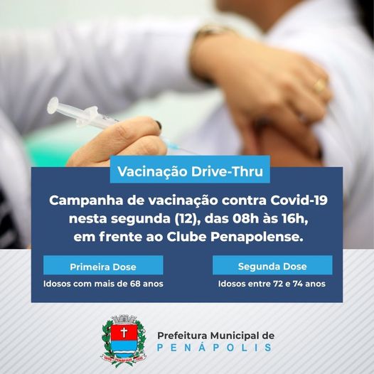 A vacinação contra a Covid-19 de idosos a partir de 68 anos continua nesta segunda-feira (12), com o drive-thru em frente ao Clube Penapolense (avenida Luiz Osório, 22), das 08h às 16h. Idosos de 72 a 74 anos também podem aproveitar para tomar a segunda dose da Coronavac, seguindo a data agendada em suas carteirinhas de vacinação, com intervalo mínimo de 21 dias da primeira dose. Até o momento, Penápolis já aplicou 12.513 doses, sendo que 8.946 pessoas já receberam a primeira dose e 3.567 completaram a vacinação com a aplicação da segunda dose.