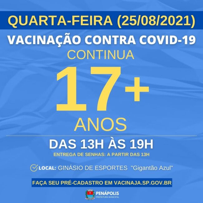 A Prefeitura de Penápolis informa que continua nesta quarta-feira, 25 de agosto, a vacinação contra a Covid-19 para os adolescentes a partir de 17 anos sem comorbidades.