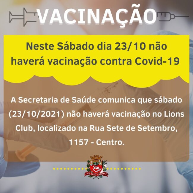 A Secretaria de Saúde comunica que sábado (23/10/2021) não haverá vacinação no Lions Club, localizado na Rua Sete de Setembro, 1157 – Centro.