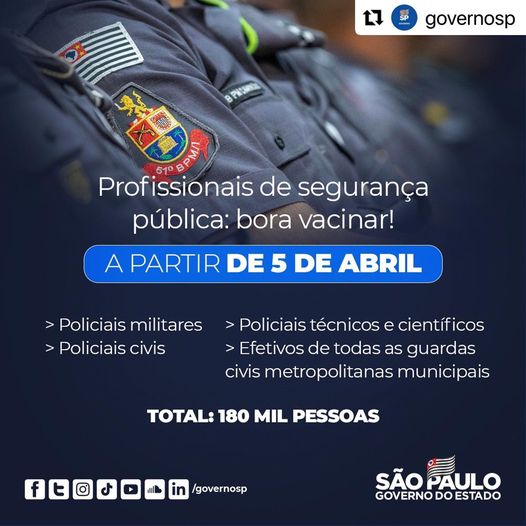 #VacinaParaTodos 💉 Chegou a vez dos profissionais de segurança pública se vacinarem contra o coronavírus! A partir do dia 5 de abril, todos os 180 mil trabalhadores dessa categoria serão imunizados.