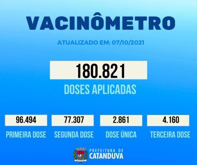 Vacina para todos! Acompanhe a evolução da imunização contra a covid-19 em Catanduva com divulgação por doses. Ao todo, 180.821 vacinas foram aplicadas, sendo 96.494 utilizadas na primeira dose e 77.307 na segunda dose. Dose única soma-se 2.861 aplicações. Já a dose reforço para idosos acima de 60 e imunossuprimidos +18 anos são 4.160 aplicações.