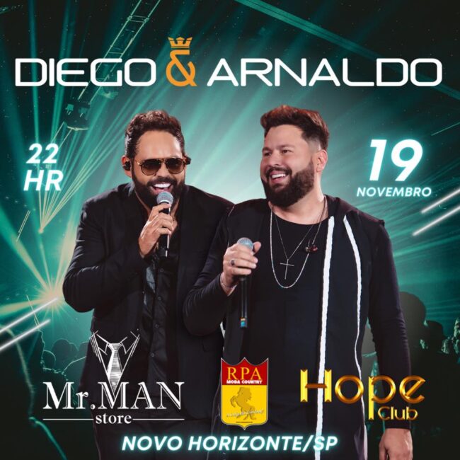 Pra quem queria evento vem aí Diego e Arnaldo, esse mega show acontecerá no dia 19 de novembro, fique atento e corra garantir o seu ingresso!!!Não fique de fora dessa, o evento será na casa mais badalada de Novo Horizonte e conta com a sua presença, você não vai ficar de fora dessa não é mesmo?Os eventos estão voltando, respeitando todas as medidas de proteção contra a Covid-19.