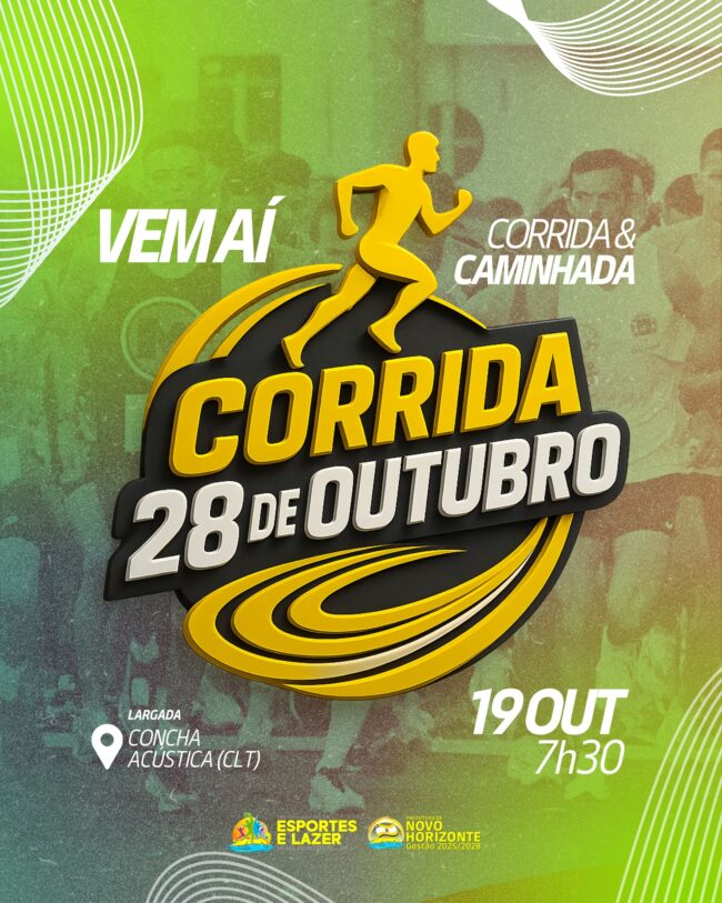 Trata-se CORRIDA & CAMINHADA 28 DE OUTUBRO que fará parte dos festejos de 108 anos de nosso município. A prova esta programada para ocorrer no dia 19 de outubro as 7;30 horas com largada na Concha Acústica do Centro de Lazer do Trabalhador (CLT). Em breve estaremos anunciando maiores detalhes e também as informações sobre as inscrições do evento. Arte: D. Comunicação/PMNH