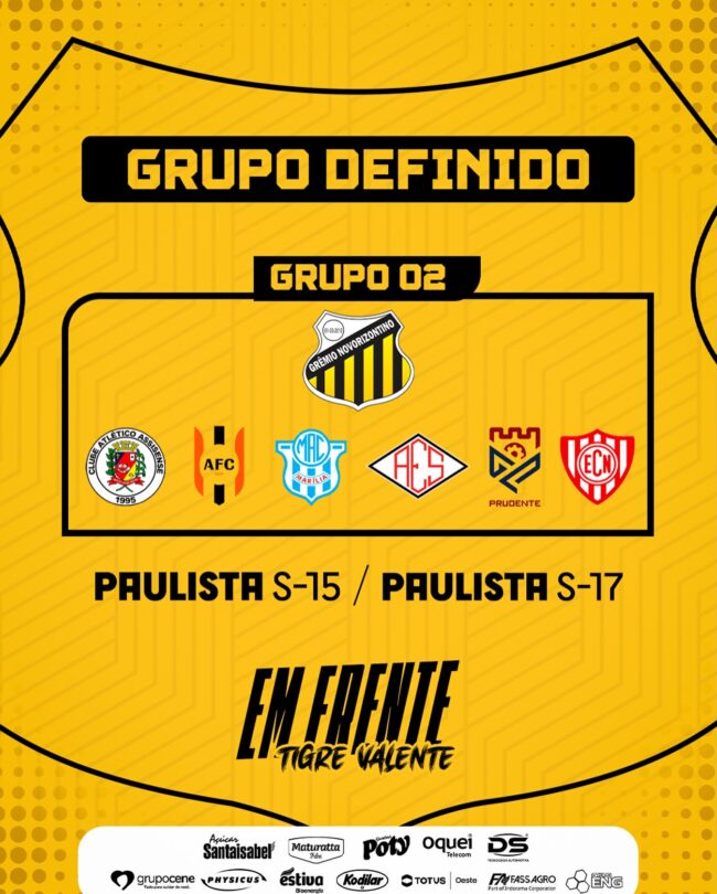 O Grêmio Novorizontino conheceu seus adversários na 1ª fase do Campeonato Paulista SUB/15 e SUB/17, que terá seu início em 25 de abril. Em ambas as categorias, o Tigre compõe o Grupo 2 ao lado de Araçatuba, Santacruzense, Assisense, Noroeste, Grêmio Prudente e Marília. São 92 equipes divididas em 13 grupos regionalizados, que se enfrentam em jogos de turno e returno dentro das chaves, avançando à 2ª fase os 3 melhores de cada grupo e os 9 melhores quartos colocados.