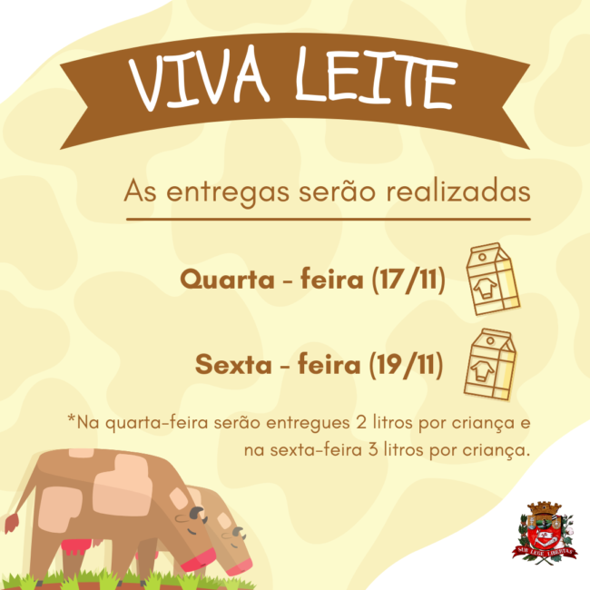 A Secretaria de Saúde e a Diretoria de Assistência e Desenvolvimento Social solicita às famílias atendidas pelo Programa Viva Leite que se atentem as datas das entregas. As entregas serão realizadas nas UBS’s.